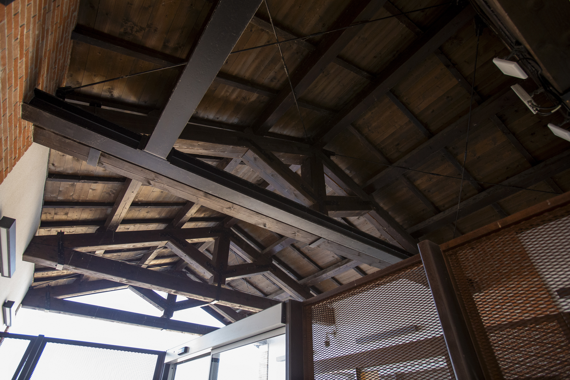 La zona di arrivo della funicolare è coperta con una struttura a due falde in legno massiccio con capriate, mentre la zona ristoro è coperta da una struttura in legno lamellare MULTIFALDA.
